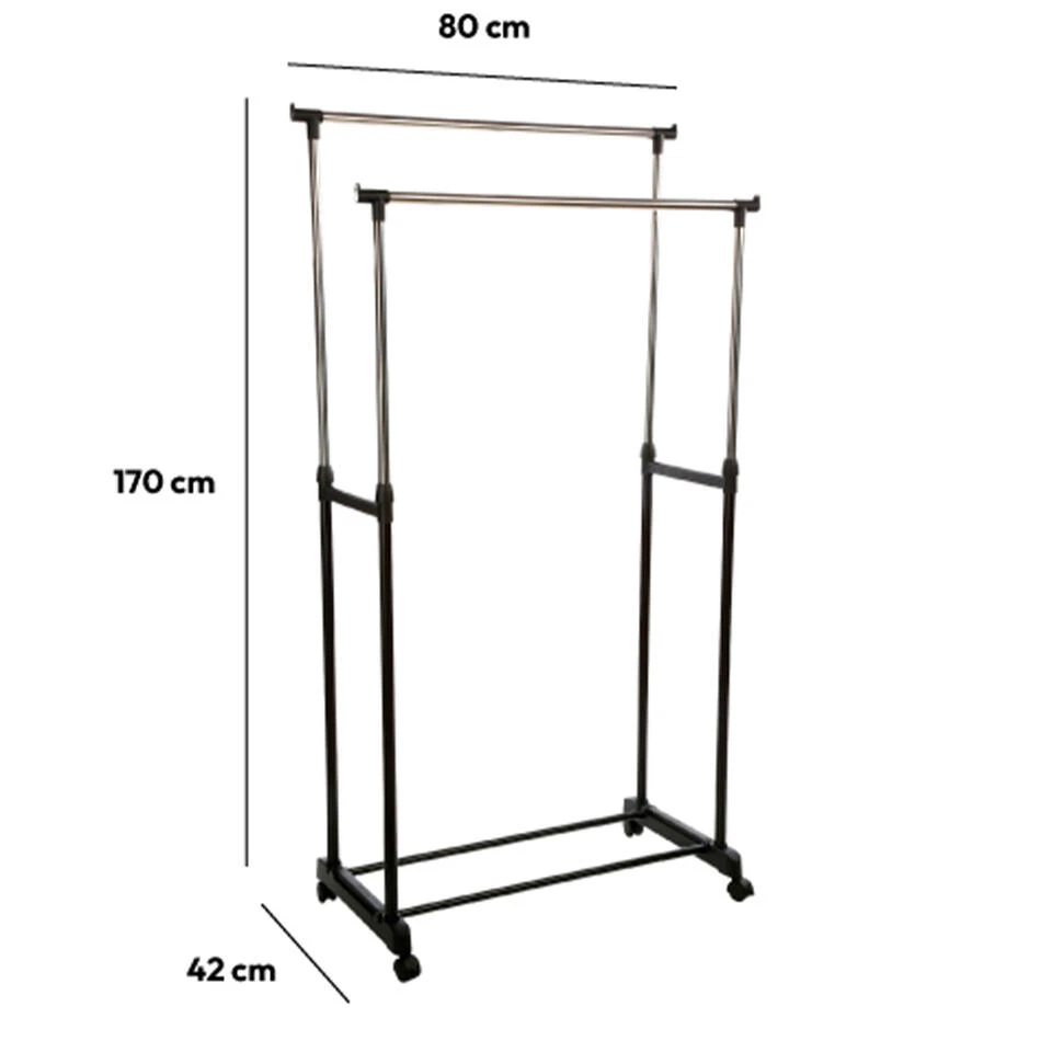 Kledingrek met dubbele hangkleding stangen gemaakt van kunststof(PP) en rvs metaal in de kleur zwart. Afmetingen: 80 x 42 x 170 cm. Uitschuifbare hoogte van 97 tot 170 cm. Makkelijk te verplaatsen met de zwenkwielen. Zelf monteren. Draagvermogen maximaal 20 kilo. Handig kledingrek voor slaapkamer en/of zolder.