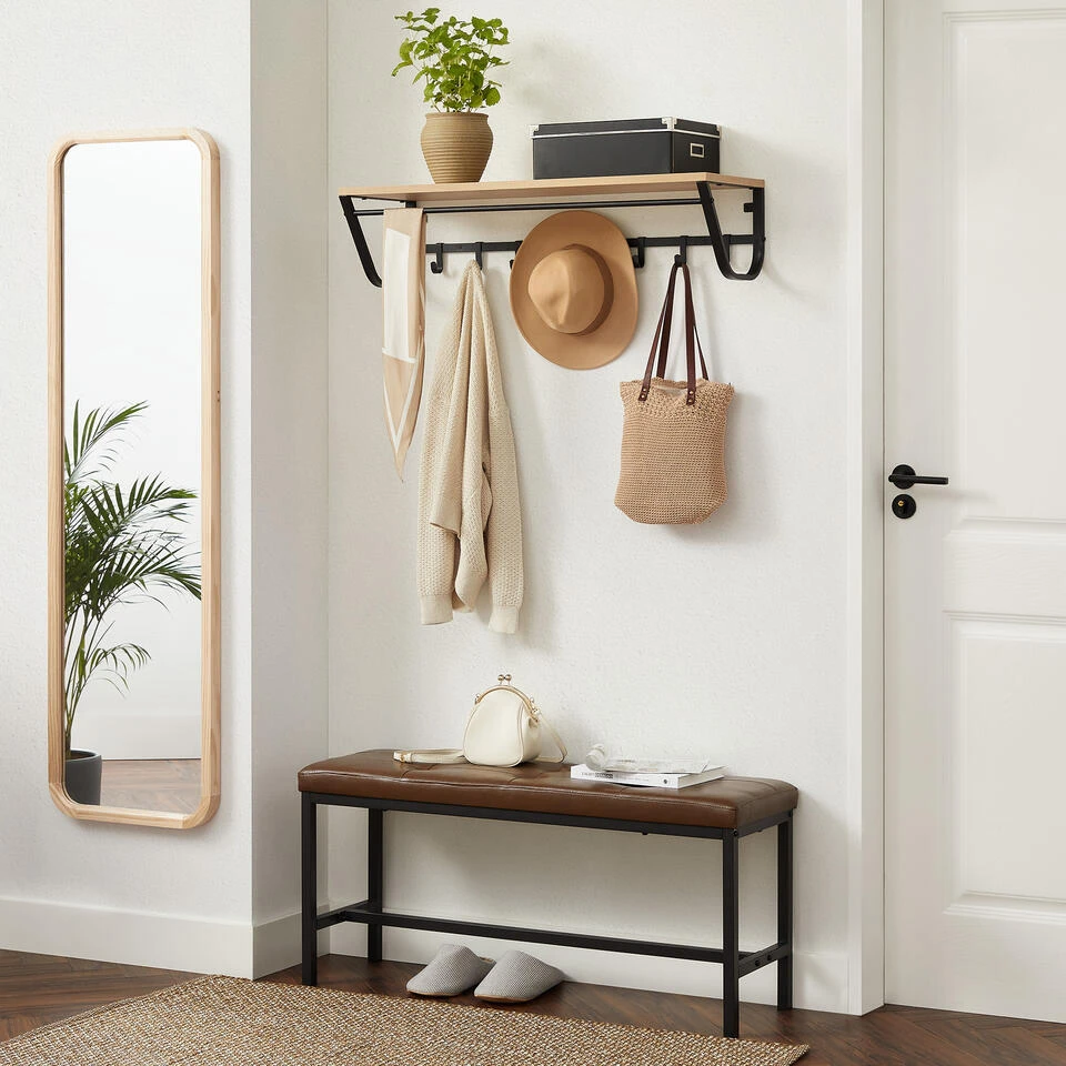 Deze kapstok combineert verschillende ophang- en opbergmogelijkheden met een plank, een rail en meerdere haken. De kapstok neemt weinig ruimte in beslag, maar is toch zeer praktisch. De kapstok heeft een leuke lichte toets waardoor ze een echte eyecatcher zal zijn in uw hal, badkamer of woonkamer.
