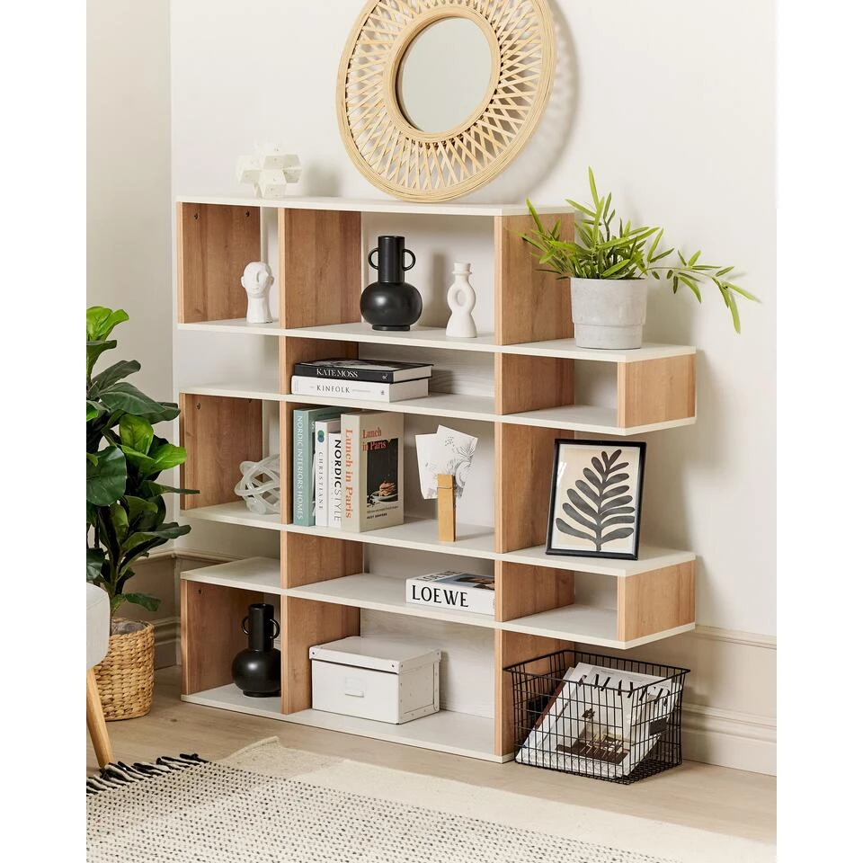 Open boekenkast. Met deze moderne boekenkast vind je eindelijk ruimte voor al je spulletjes. Met vijf niveaus van open planken biedt het voldoende ruimte voor boeken, decoratieve items, en meer. Als je gesloten opbergruimte nodig hebt, kun je het gemakkelijk combineren met manden. Het asymmetrische frame en de verschillende groottes van de planken geven het een karakter en een stijlvolle uitstraling, die elke moderne inrichting zal verbeteren.