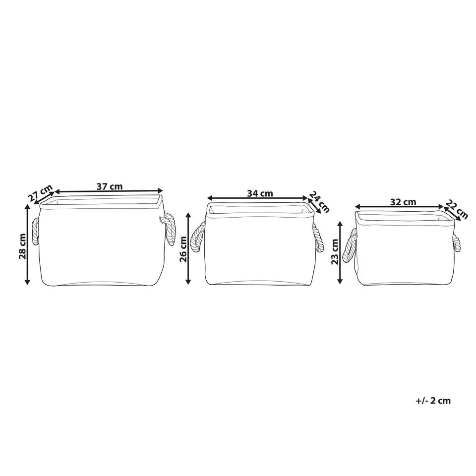 3-delige opbergmandenset. Deze set opbergmanden past dankzij het universele en eenvoudige ontwerp in elk interieur. Het is verkrijgbaar in drie verschillende maten en passen op de meest noodzakelijke kleinere of grotere spullen. Gevlochten handgrepen geven ze een maritiem karakter, waardoor ze er geweldig uitzien op open planken.