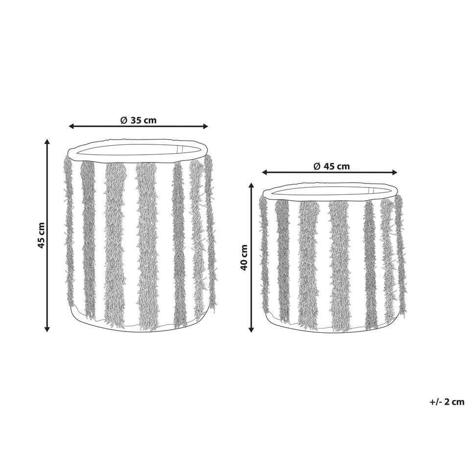 Handgemaakte katoenen manden. Voeg deze multifunctionele manden toe aan je woonkamer of badkamer om ze een boho-stijl te geven en de kamer uit te rusten met extra opbergruimte. Omdat beide stukken zijn gemaakt van katoen en wol, zijn ze duurzaam en hebben ze geen dagelijks onderhoud nodig. De zijkanten zijn versierd met decoratieve franjes, die zeker de aandacht zullen trekken, en dankzij hun beige kleur passen ze gemakkelijk in verschillende interieurstijlen.