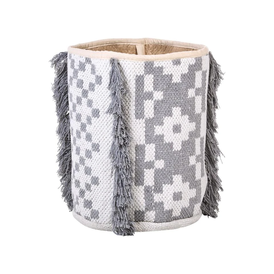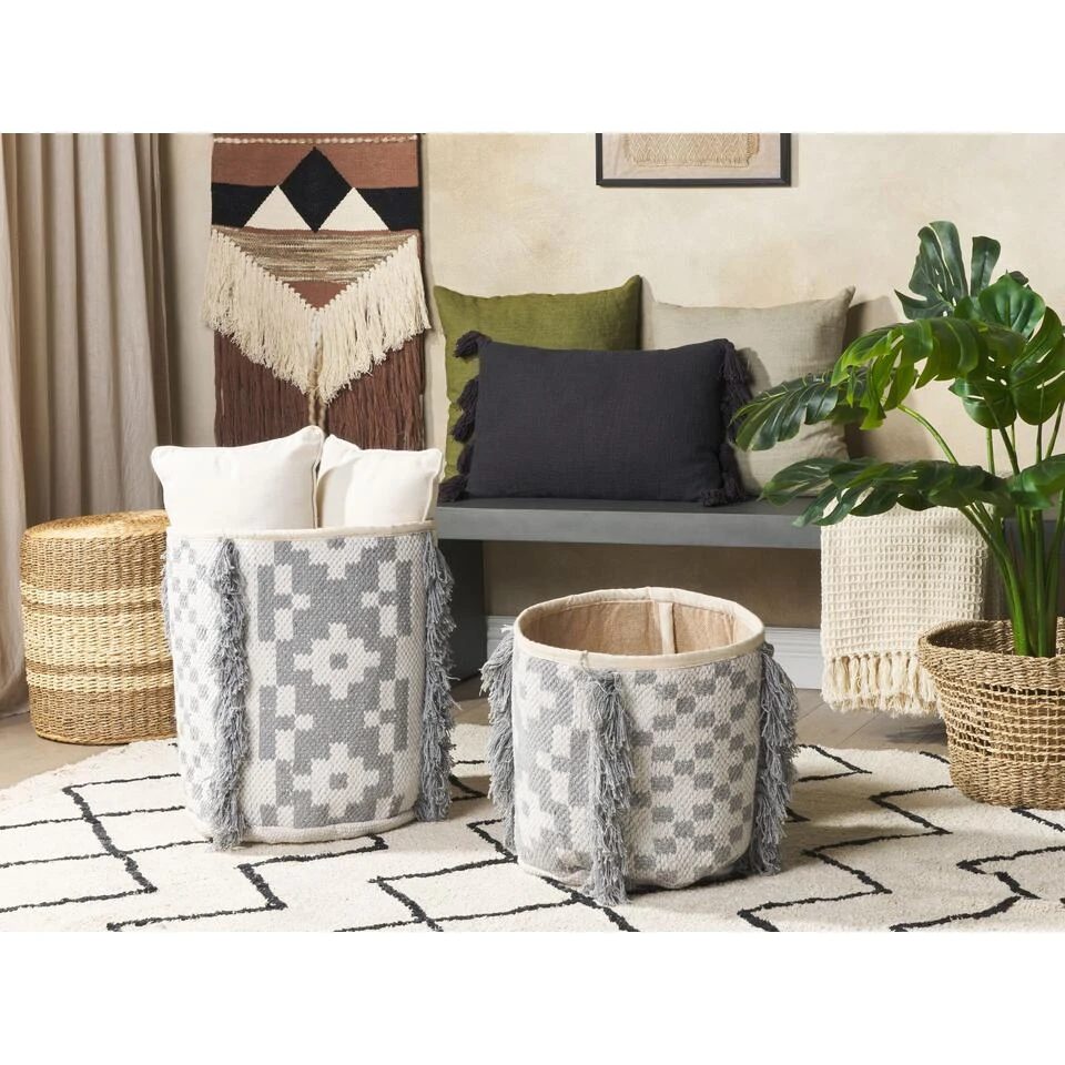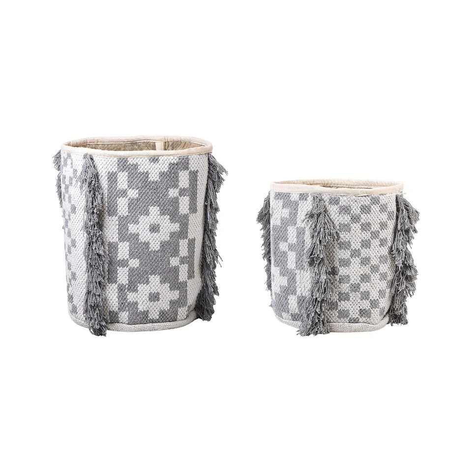 Handgemaakte katoenen manden. Als je op zoek bent naar een snelle en eenvoudige manier om een frisse touch toe te voegen aan je inrichting, dan zal deze set van 2 katoenen manden ongetwijfeld een uitkomst bieden. Vanwege de toegepaste materialen zijn ze bovendien duurzaam en eenvoudig te onderhouden. Het grootste pluspunt is het ontwerp, dat een opvallend geometrisch patroon combineert met charmante decoratieve franjes.