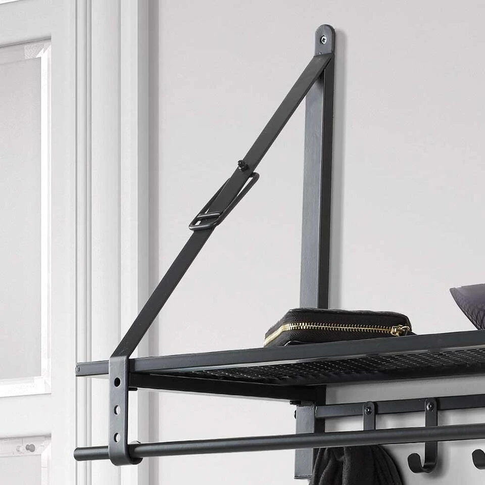 Functionele kapstok voorzien van 8 haken, tevens voorzien van een roede voor kleding hangers en een legplank van gaas om kledingstukken (of accessoires) op te leggen. De kleur van deze kapstok is niet zwart maar donker grijs (RAL 7016).