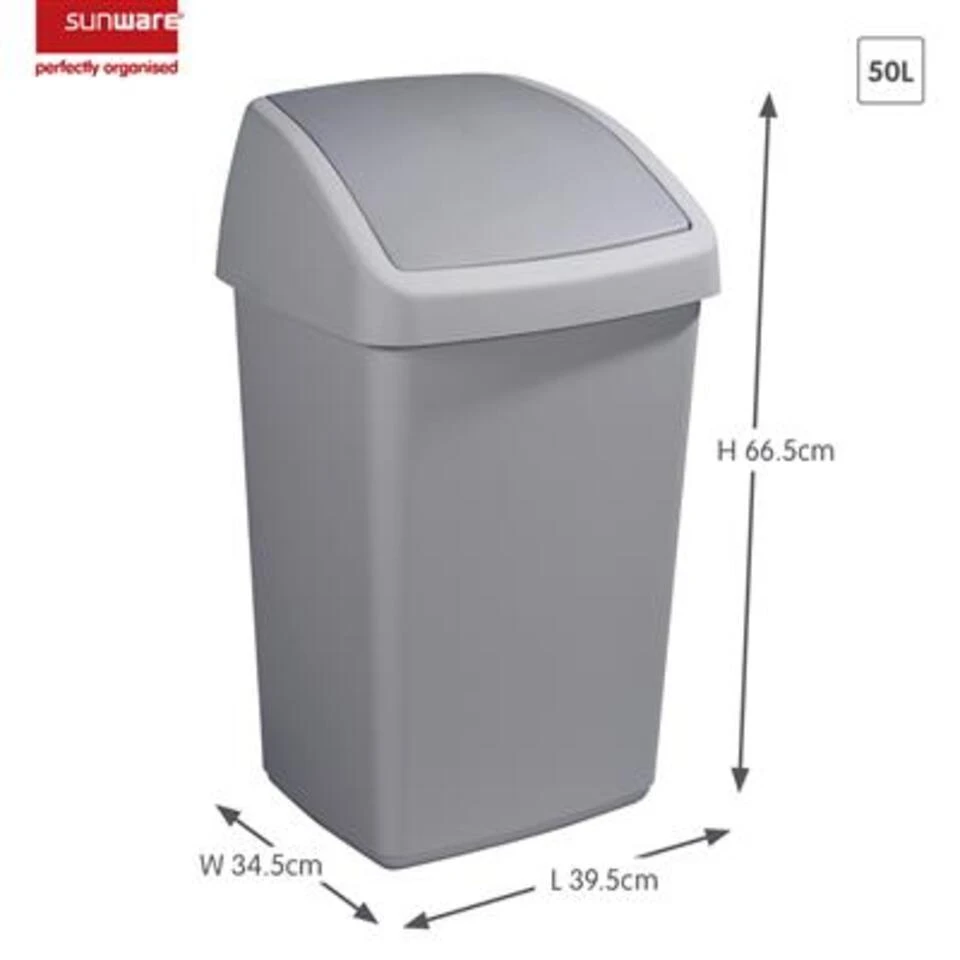 Deze 50 L Delta prullenbak van Sunware is uitgerust met het zogenoemde ‘Swing’ deksel welke een aantal belangrijke voordelen biedt: