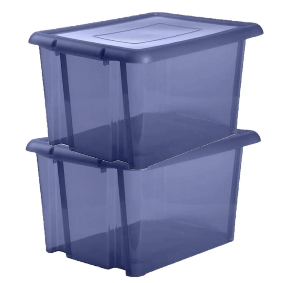 Opbergbox/opbergdoos stapelbaar. Multifunctionele opberger voor het vocht- en stofvrij opbergen van een grote variatie spullen. De box is makkelijk te stapelen voor optimaal opberggemak. Ook is hij voorzien van handige en stevige sluitclips zodat het deksel goed op zijn plaats blijft. Inhoud: 80 liter. Afmetingen (lxbxh) ca: 65 x 50 x 36 cm. Kleur: transparant donkerblauw. Materiaal: kunststof.