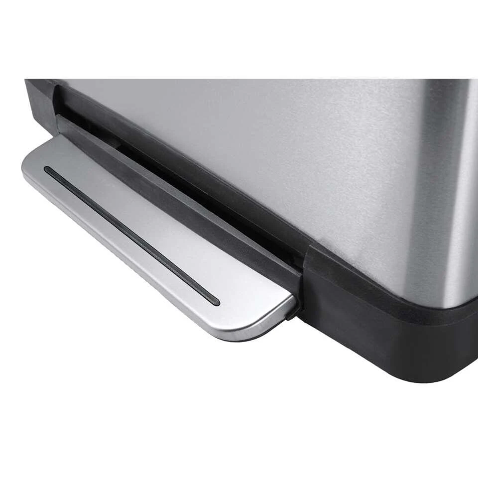 De stijlvolle rechthoekige EKO E-Cube recycling pedaalemmer 10+9 liter van mat RVS met fingerprint proof coating, heeft een extra breed pedaal en twee kunststof binnenemmers voor afvalscheiding. Voorzien van gedempt deksel met stay open functie voor het makkelijk schoonmaken en verwisselen van de afvalzak.