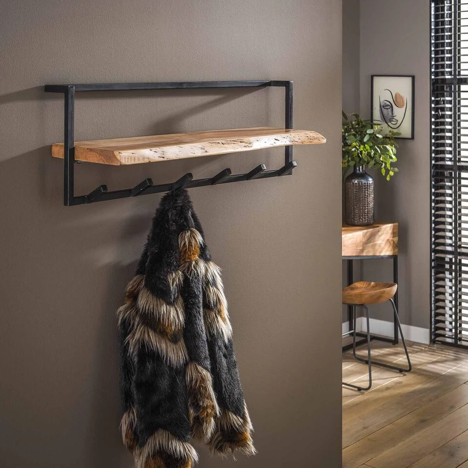 Deze kapstok is voorzien van een hoedenplank gemaakt van massief acacia hout en de buis is uitgevoerd in grijs gepoedercoat staal. Acacia hout is zorgvuldig geselecteerd hout, voorzien van een fijne nerf en diverse noesten, die op ambachtelijke wijze wordt verwerkt. Dit zorgt voor een natuurlijke én unieke look aan de wand. Aan de hoedenplank zijn er 6 grijze gepoedercoate stalen haakjes bevestigd. De kapstok is verder voorzien van twee bevestigingsogen aan de achterzijde, zodat hij eenvoudig aan de wand kan worden gemonteerd.