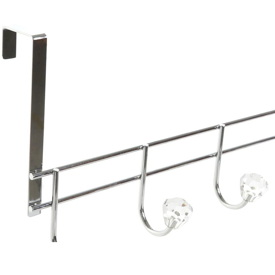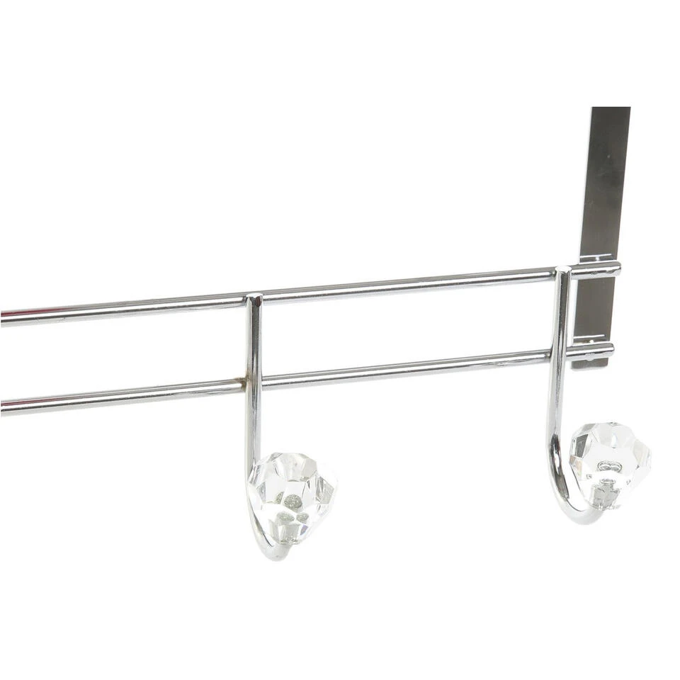 Een kapstok zilver met 5 haken, welke u aan uw deur kunt hangen. De haken zien eruit als kristallen. Let op: Enkel geschikt voor stompe deuren van 40 mm dik. Afmeting: ca. L47 x B10 x H22 cm. Materiaal: metaal. Deurhanger kapstokken badkamer/slaapkamer accessoires.