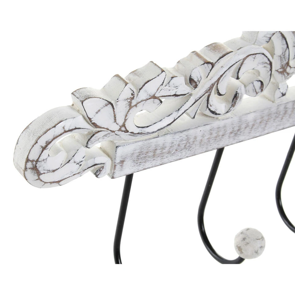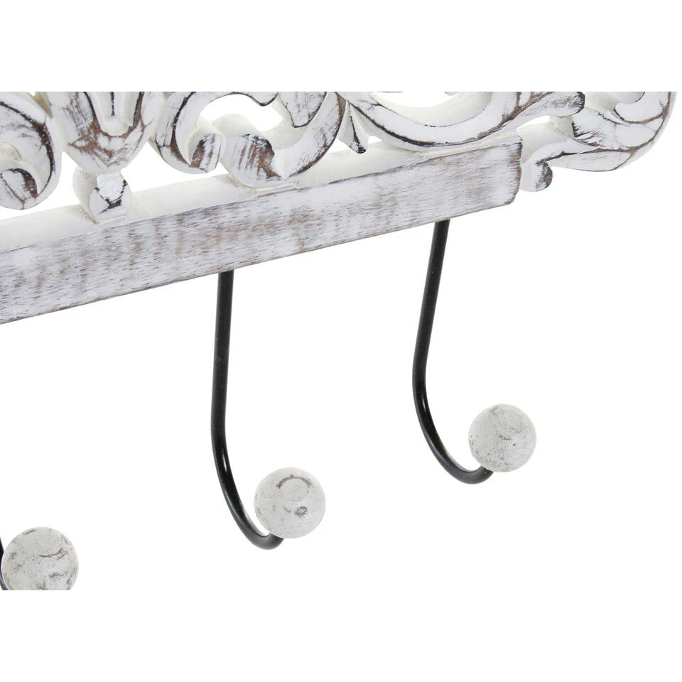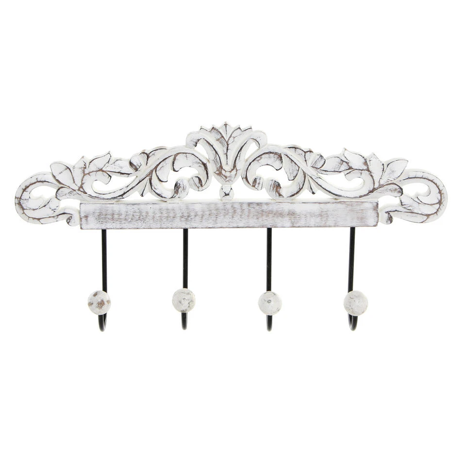 Items kapstok rek voor aan de muur/wand in de kleur wit met sierlijk ornament aan bovenzijde. Ideaal om je jassen en hoofddeksels aan op te hangen, dankzij de 4x ophanghaken/knoppen is er genoeg ruimte om diverse stukken op te hangen. Afmeting: 40 x 6.5 x 19 cm. Materiaal: Mangohout/metaal. Wandkapstokken.