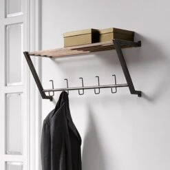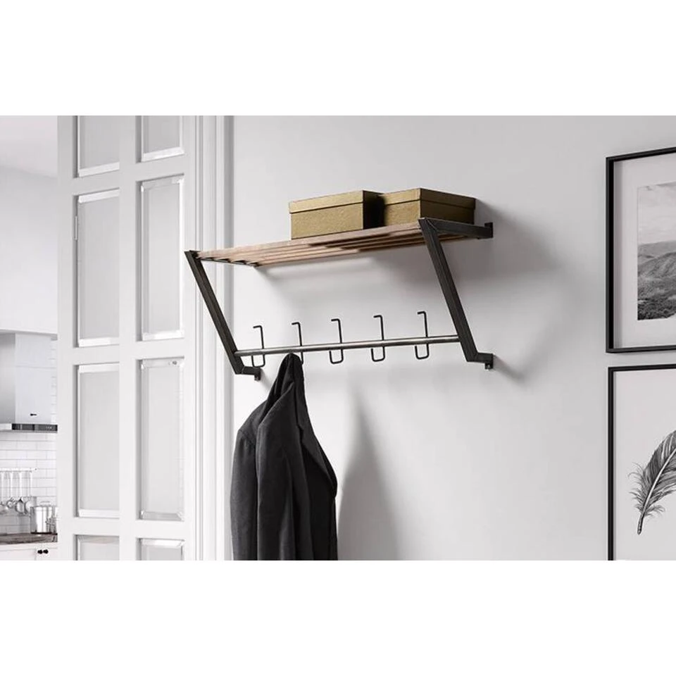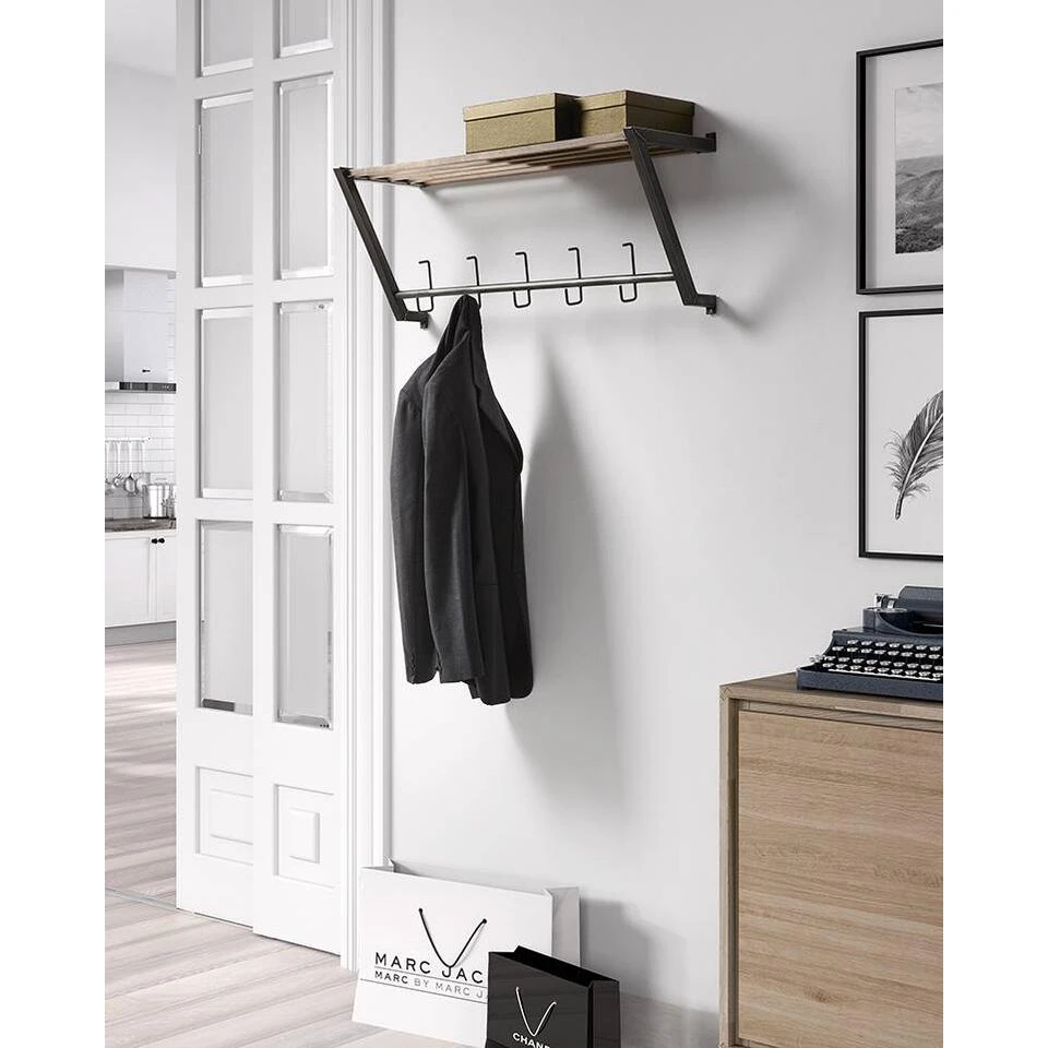 Industriële kapstok met 5 haken, de hoedenplank is gemaakt van hout. Breedte: 89 cm, hoogte: 34 cm, de kapstok komt 28 cm van de muur af. Dit is een ‘bouwpakket’ en krasjes zijn bij dit produkt niet uit te sluiten, excl. kleding hangers.