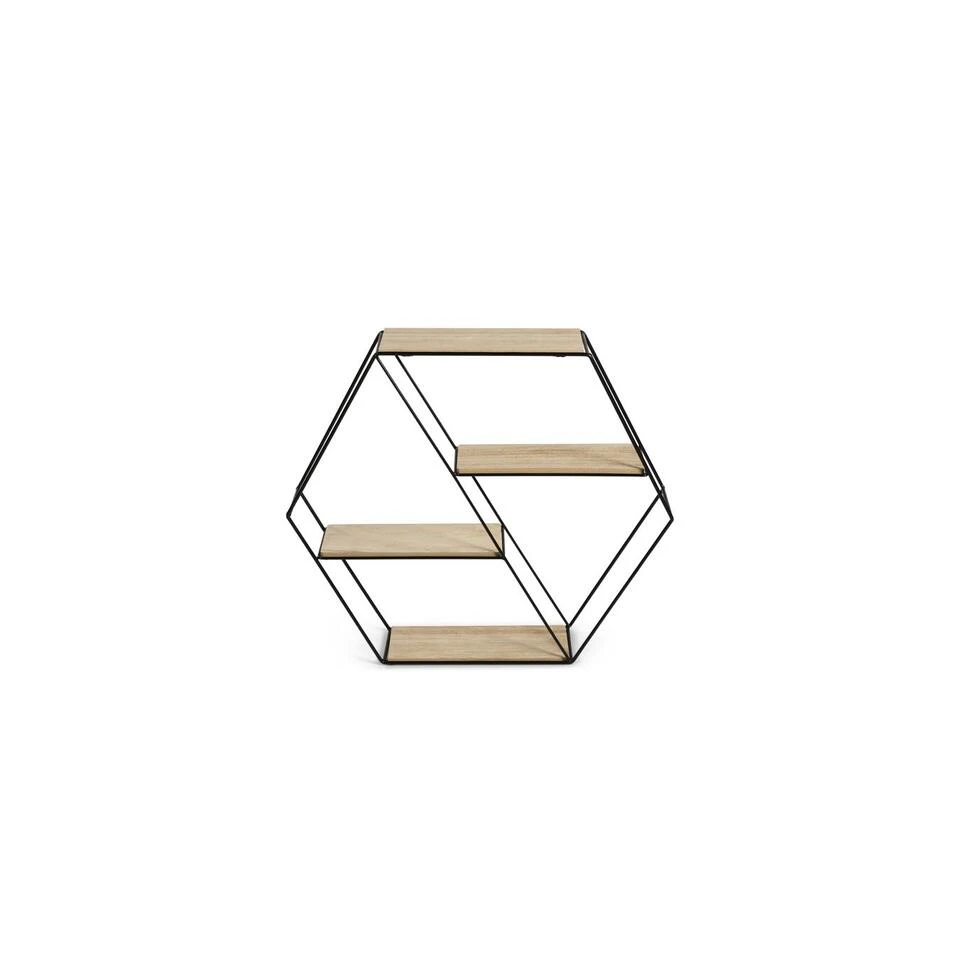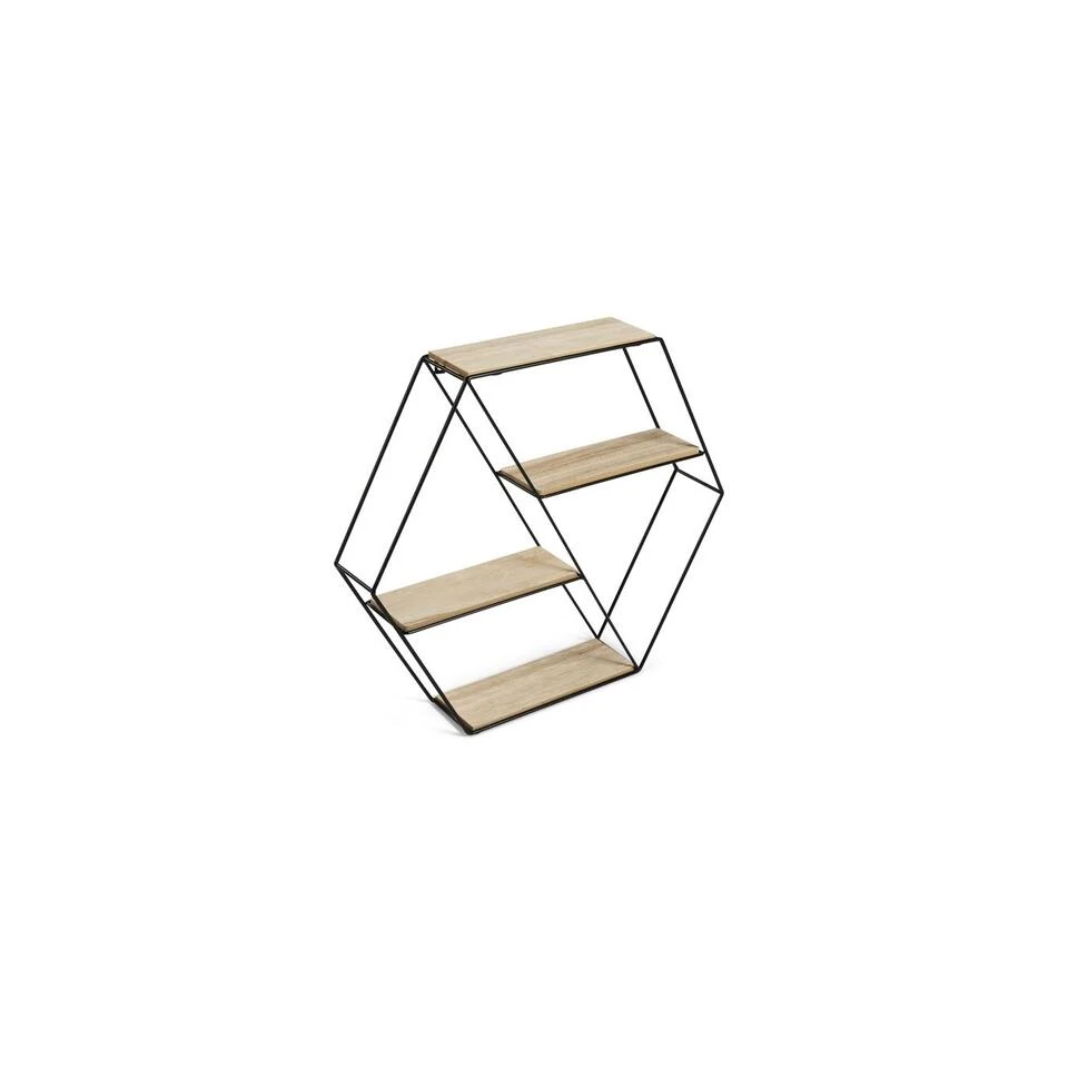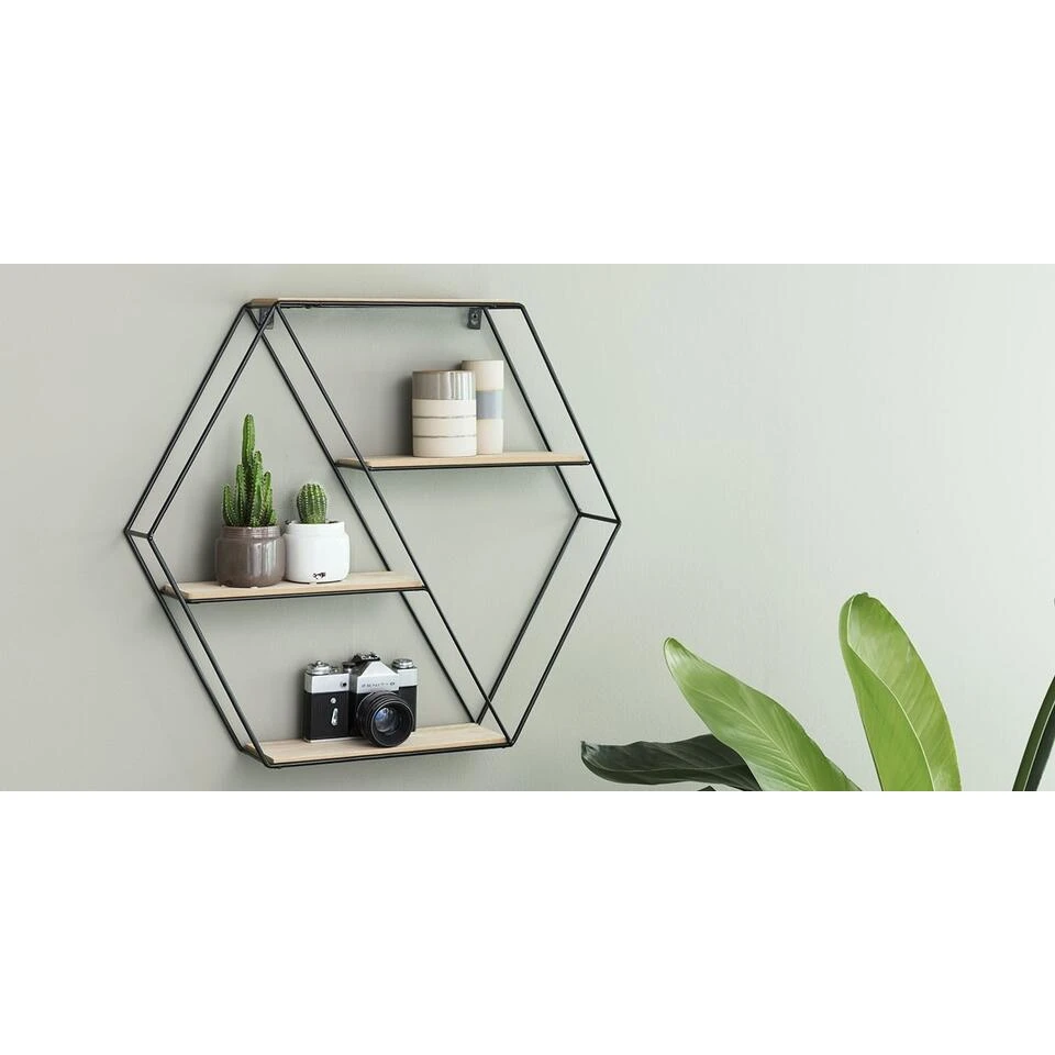 Het zeshoekige wandrek heeft een moderne en elegante uitstraling en is voorzien van stevige planken die gemaakt zijn van MDF-hout. Het frame van het rek is gemaakt van metaal. Het wandrek heeft een afmeting van 58 x 51 x 11 cm. De planken hebben een diepte van 11 cm. Dit wandrek is verkrijgbaar in verschillende varianten, namelijk met houten opbergplanken of met metalen opbergplanken.