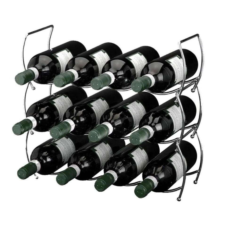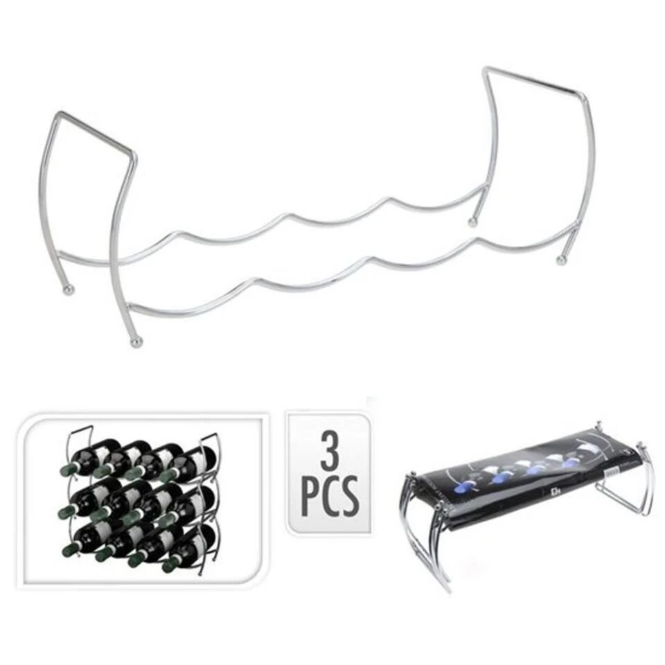 3-delig wijnrek voor 12 flessen. Dit wijnrek is stapelbaar en hierdoor uit te breiden voor meer flessen wijn. Materiaal: verchroomd RVS. Afmetingen: 42 x 16 x 16 cm en wanneer er 3 lagen op elkaar staan is de hoogte 40 cm.
