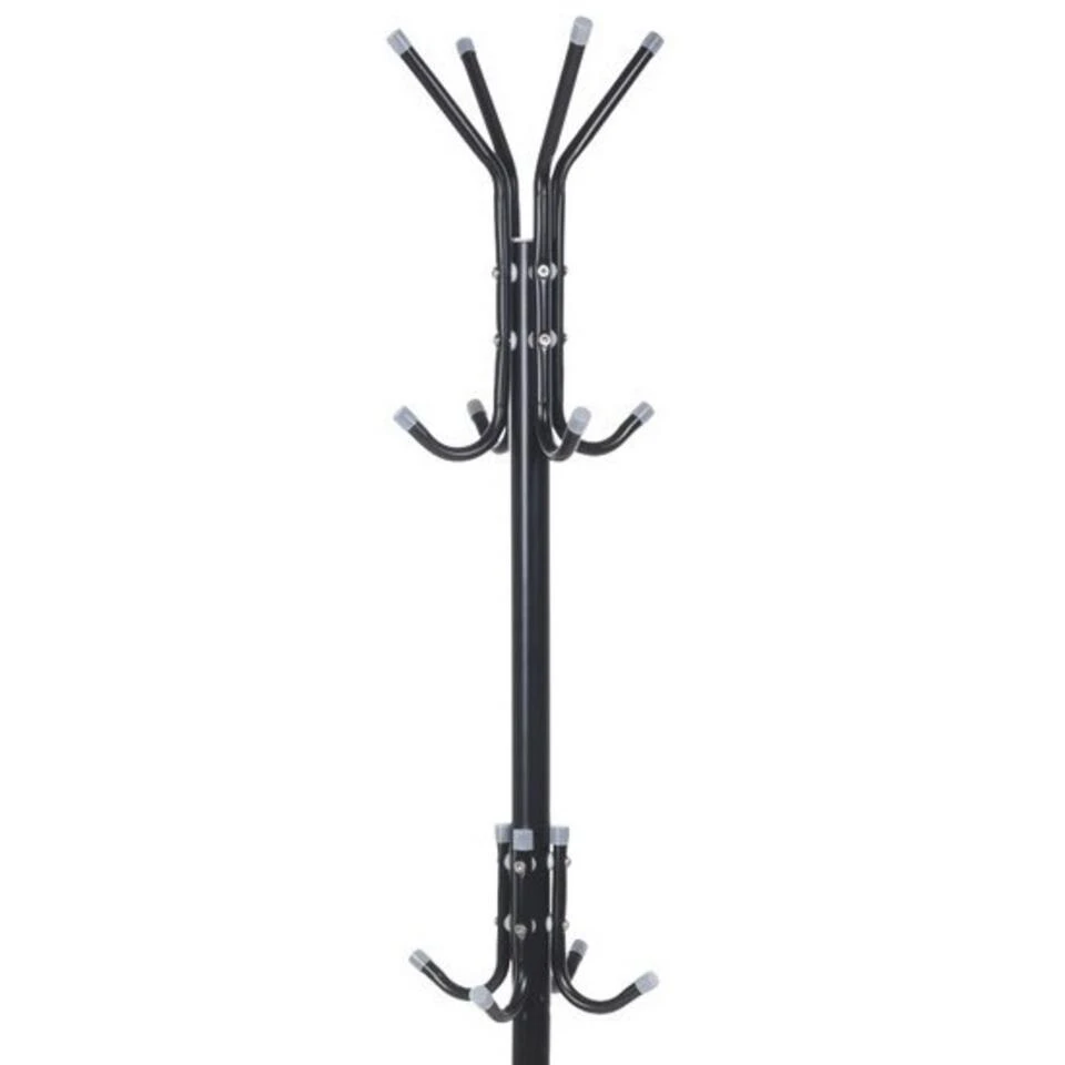 Een zwarte staande 3-poots kapstok, met een totale hoogte van ca. 172 cm. Aan de bovenkant is ruimte voor 8 jassen en in het midden kunnen bijvoorbeeld 4 kinderjassen of tassen hangen. Met anti-slip nopjes, zodat de kapstok niet verplaatst en de vloer beschadigd. Materiaal: Metaal met kunststof nopjes.