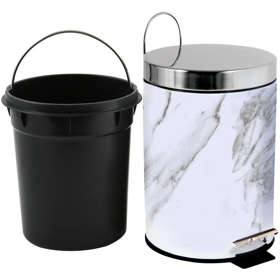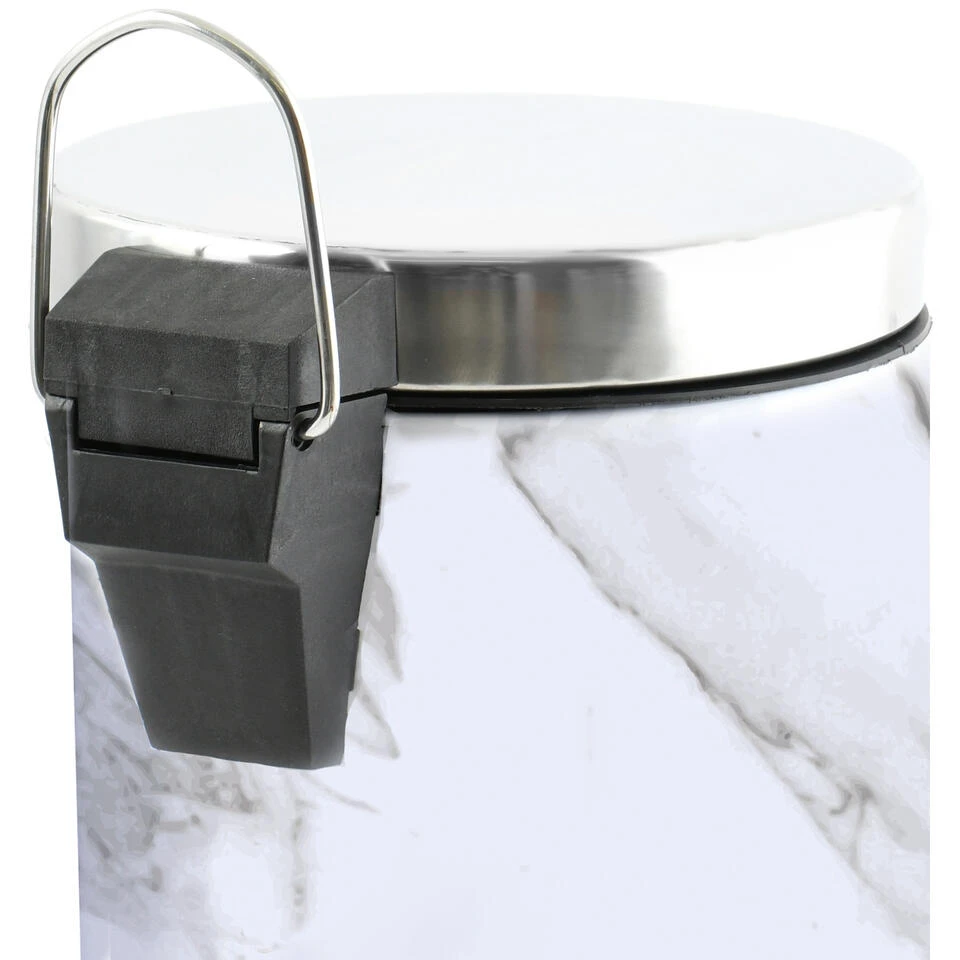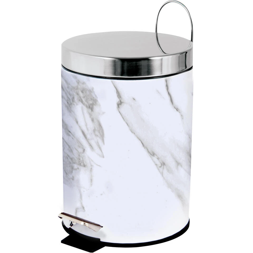 Pedaalemmer voor badkamer en toilet, klein model met inhoud 3 liter. Kleur: marmer print. Deze prullenbak is gemaakt van rvs en metaal en heeft een formaat van ca. L17 x H25 cm. Deze kleine pedaalemmers hebben een uitneembare binnenbak. De deksel is chrome zilver.