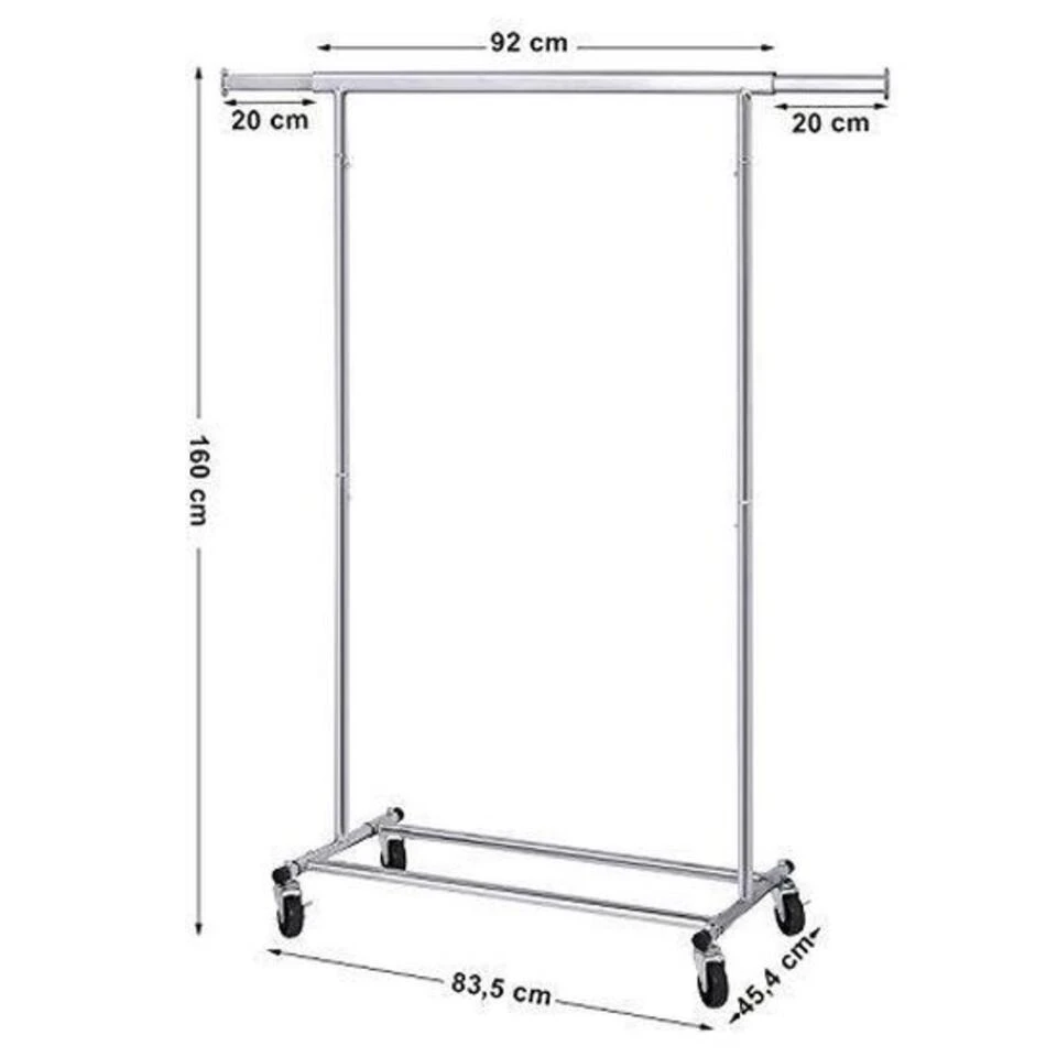 Heavy Duty Verrijdbaar Kledingrek met Uitschuifbare Kledingstang van 92 -> 132 Cm. met Zwenkwielen. Zeer stevig, professioneel (tot 90kg belastbaar!) en stabiel kledingrek met wieltjes en verstelbare breedte. Op de onderste dwarsbalken bevindt zich een praktische opbergplek, bijvoorbeeld voor schoenen. Perfect voor uw bedrijf, winkel, kantoor en voor thuis.