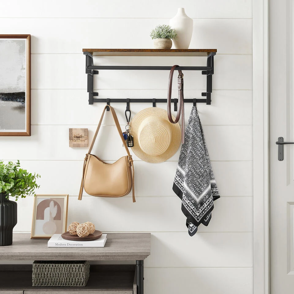 DRIE IN 1 DESIGN: Deze kapstok wordt geleverd met een grote plank (66 x 30 cm), een ophangrail en 5 haken om met een minimale ruimte aan uw verschillende behoeften te voldoen; te gebruiken als displayplank, kapstok of hoedenplank