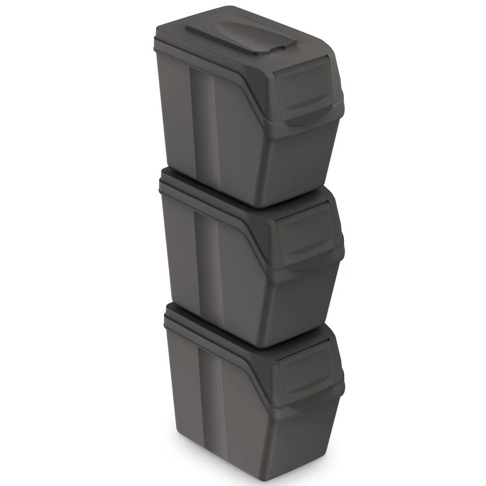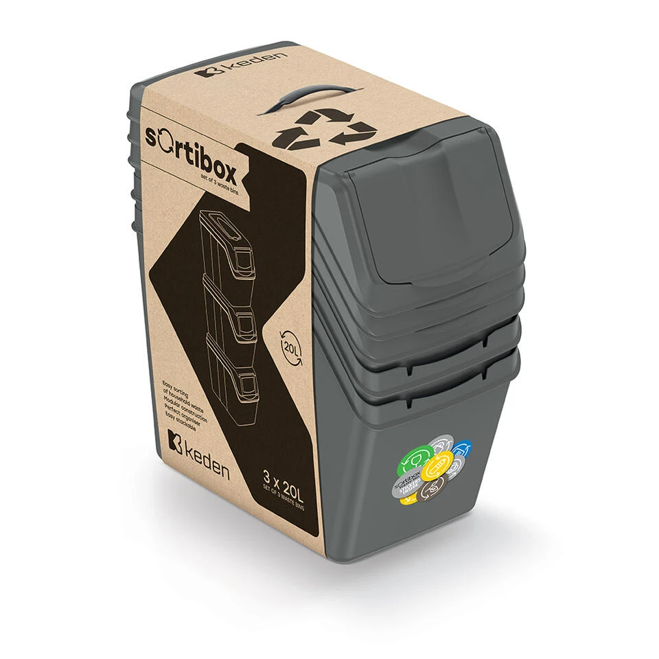 Set van 3x kunststof afvalscheidingsbakken grijs, stapelbaar. Inhoud: 3x 20 liter. Formaat: lengte: 40 cm, breedte: 23 cm, hoogte: 33 cm. Inclusief handige kleuren stickers welke verwijzen naar het soort afval voor in de prullenbak.