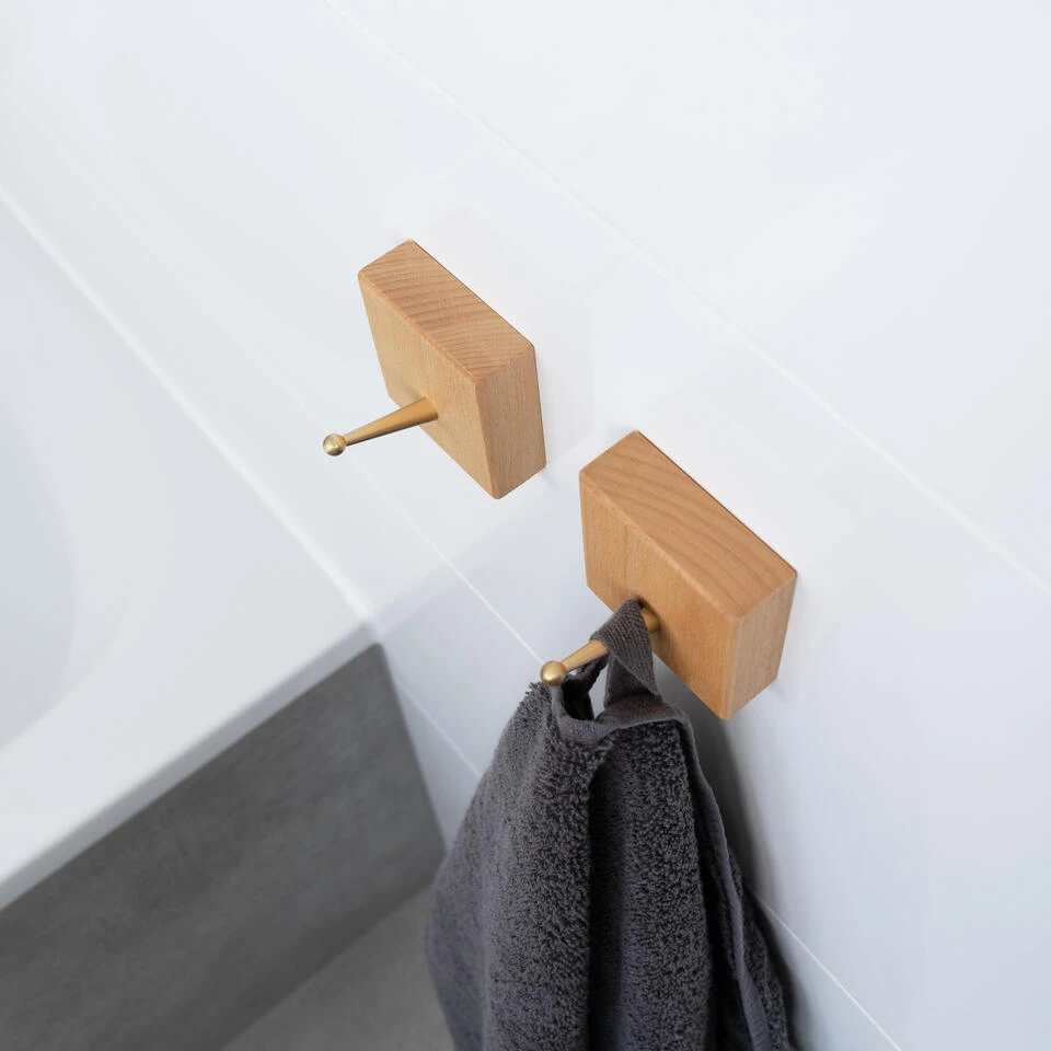 Het ontwerp van de wandhaken is elegant en simpel. De wandhaak bestaat uit een vierkant houten blok in lichtbruine kleur en een gouden haak gemaakt van messing. Het houten blokje wordt aan de muur bevestigd en je ziet de schroef nergens.