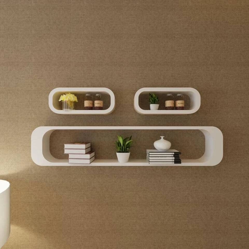 Levering bevat 3 kubusvormige wandplanken, schroeven muurpluggen.