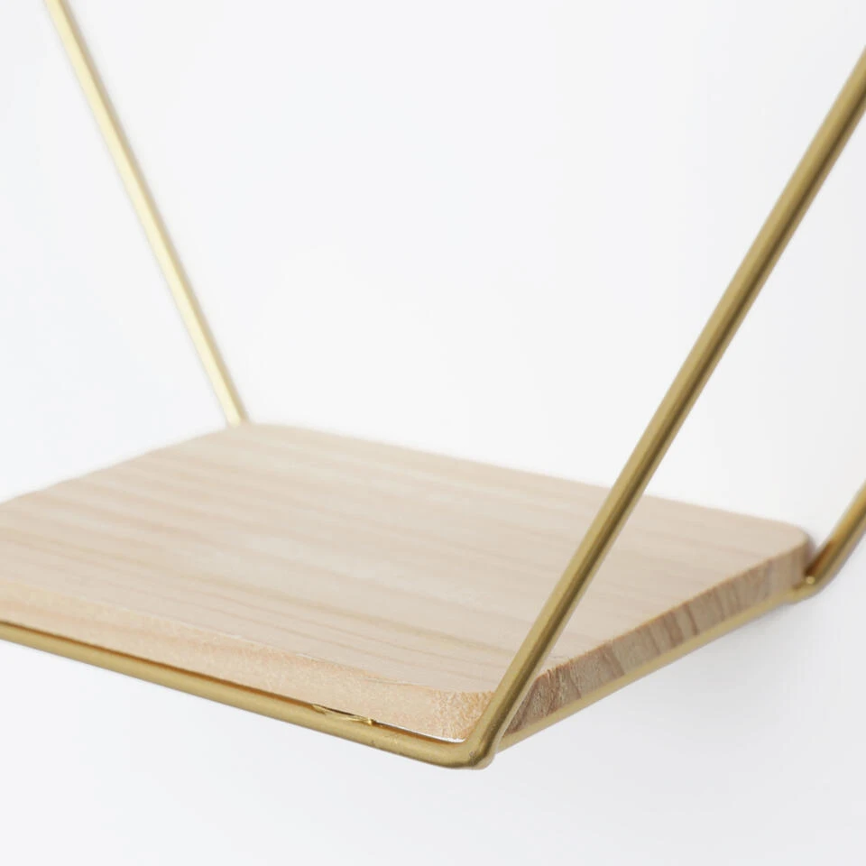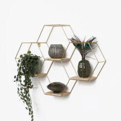 Op zoek naar een metalen wandrek om je interieur meer sfeer te geven? Wandrekken zijn dé trend van dit moment. Je kunt ze decoreren met jouw favoriete woonaccessoires. Dit hexagon wandrek heeft een goudkleurig frame en bestaat uit vier zeshoeken voorzien van houten plankjes. De honingraat vorm maakt het rekje speels en eigentijds.