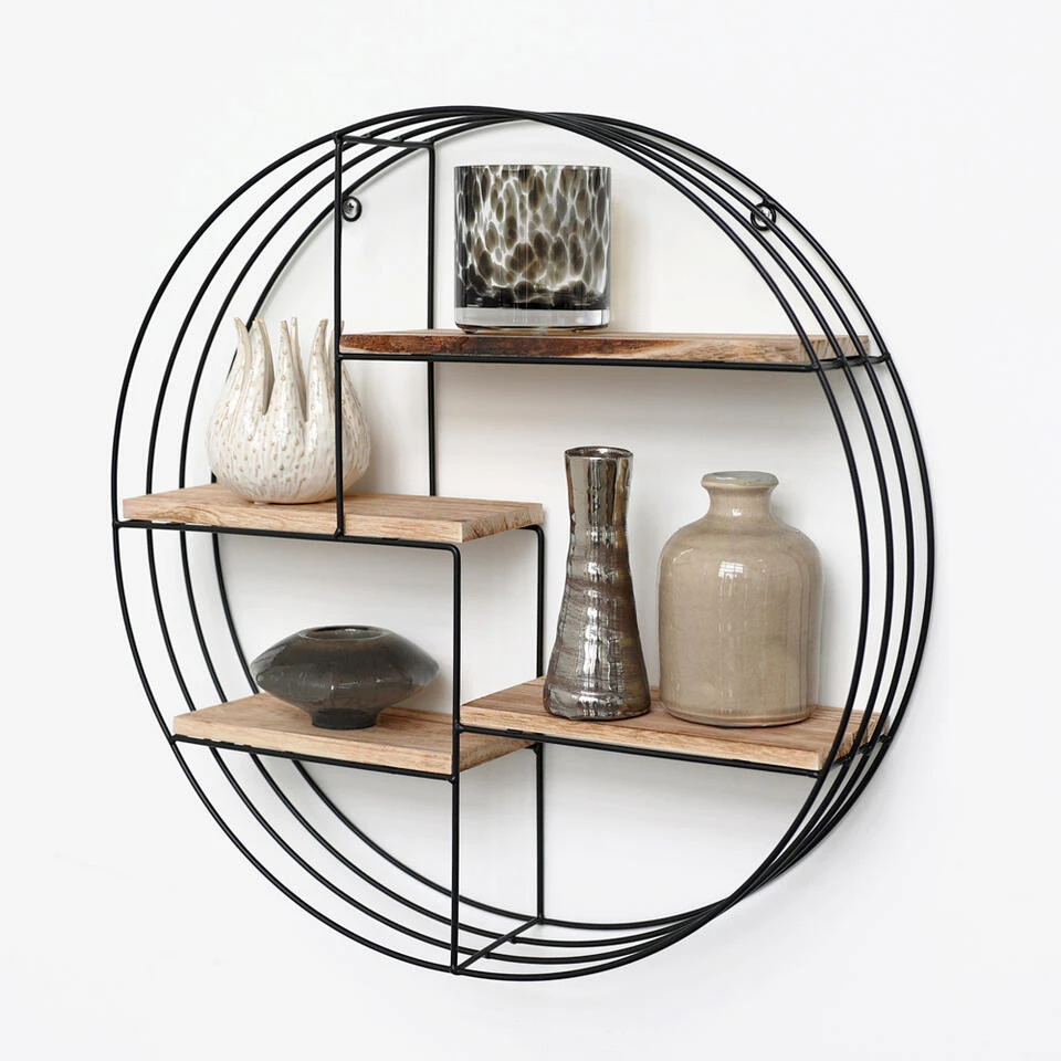 Op zoek naar een metalen wandrek om je interieur meer sfeer te geven? Wandrekken zijn dé trend van dit moment en kun je decoreren met jouw favoriete woonaccessoires. Dit ronde wandrek heeft een mat zwart frame en vier houten plankjes.